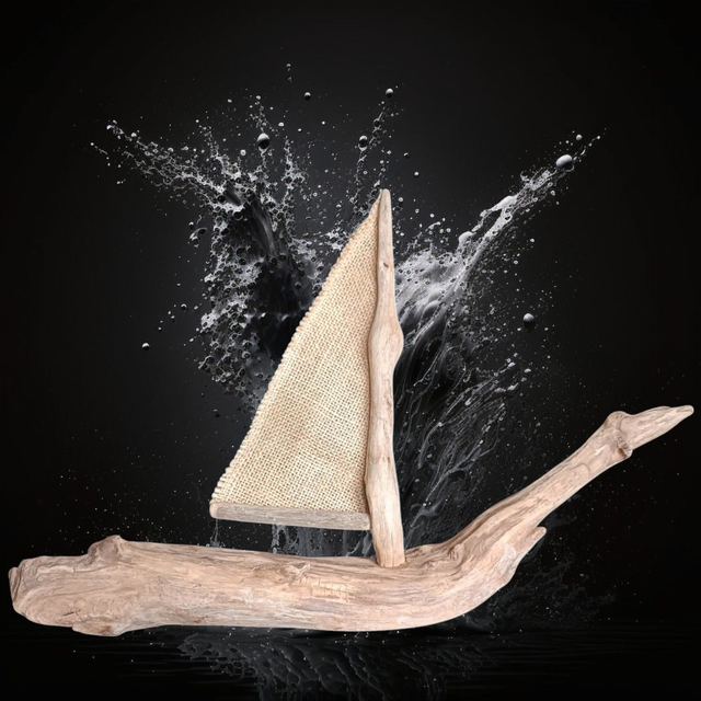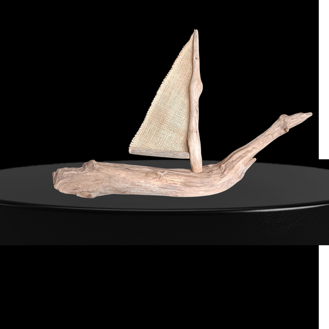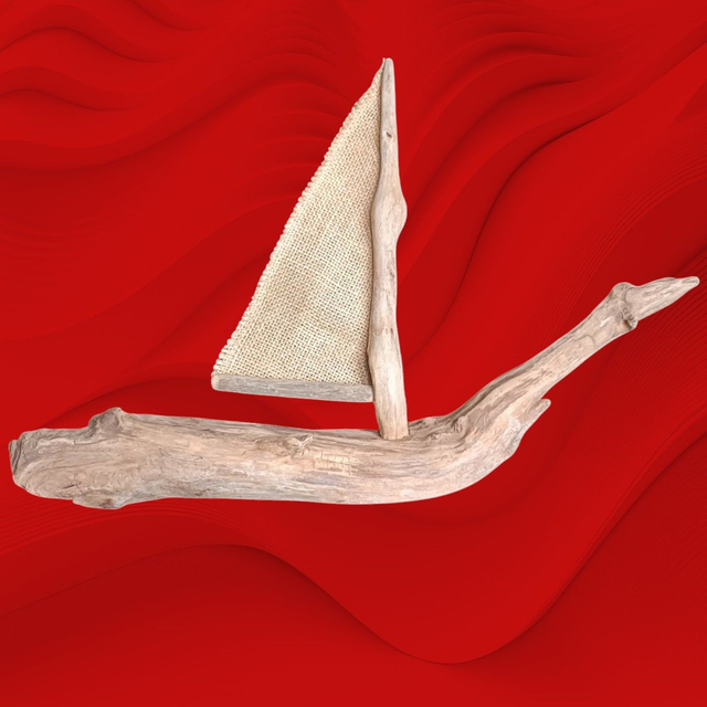 Bateau de décoration une voile. Longueur 47cm, largeur 16cm, hauteur 23.5cm.
